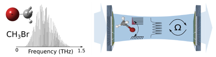 Figure 1 : Left, molecular frequency comb (MFC) of bromomethane given as an example (changing the halogen will not change much the spectrum; other radicals change he spectrum but keep the comb behavior). Right the cavity made by two facing metasurface mirrors building the optical frequency comb (OFC) and enabling the coupling between the OFC and the MFC