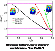 We investigated acoustic metasurfaces consisting of either single pillars or lines of identical pillars on a thin plate, used to scatter incident Lamb waves. Depending on the geometrical parameters, the monopolar (compressional) and dipolar (bending) resonances of the pillars can be excited individually or superposed [Phys Rev B 2016]. We are currently working on the demonstration of refractive properties of such structures, with application to the subwavelength focusing of elastic waves. We also presented new designs of pillars for a high confinement of local resonances, in particular the case of hollow pillars for whispering gallery modes [Phys Rev B 2016]. We investigate the case of pillars made by a multilayered material on semi-infinite substrate (see figure) [Phys Rev Applied 2018] and show physical properties as Fano resonances interactions, or acoustic induced transparency for SAW (surface acoustic waves).