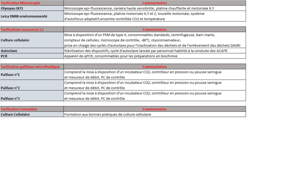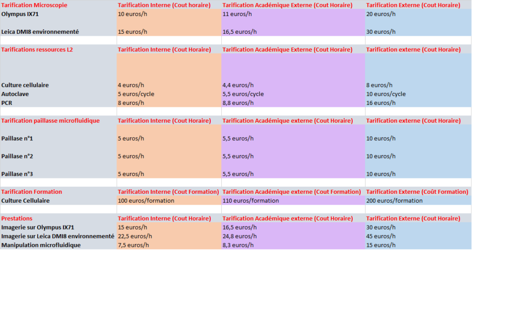 Prestations du pôle Bio Micro Fluidique – CMNF. Attention les tarifs changent au 1er janvier 2026