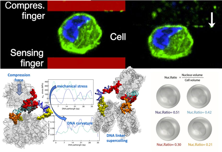 Les cellules des tissus sont affectées par des forces mécaniques à différentes longueurs et échelles de temps, et ces signaux mécaniques intracellulaires et extracellulaires affectent l’évolution de la vie cellulaire. Cependant, même si la mécanique de la cellule dans son ensemble est désormais un sujet assez bien étudié, il nous manque encore une compréhension détaillée des mécanismes par lesquels ces contraintes mécaniques sont transmises jusqu’au noyau de la cellule, et quels sont les effets de la déformation mécanique sur les processus nucléaires, impliquant la (ré)organisation de la chromatine et éventuellement les fonctions génétiques en aval associées à l’ADN.Le projet DNASTRIX vise à étudier et à quantifier comment la mécanique nucléaire peut être modifiée par les forces issues de l’environnement cellulaire, et quelles sont les implications génomiques clés de ces processus mécaniques, de l’échelle cellulaire jusqu’à l’échelle moléculaire, potentiellement impliqués dans de nombreuses maladies humaines. Pour atteindre des objectifs aussi ambitieux, nous repousserons les limites d’un ensemble de techniques innovantes basées sur des dispositifs de systèmes micro-électromécaniques (MEMS), en cours de développement actif dans nos laboratoires, grâce auxquelles nous pouvons appliquer des forces contrôlées à la fois aux agrégats moléculaires, et à des cellules vivantes entières, tout en effectuant une fluorescence en temps réel et une imagerie confocale. En parallèle, nous exploiterons un programme de modélisation théorique et informatique par dynamique moléculaire (atomique et à gros-grains) des protéines clés participant aux actions mécaniques transmises à la chromatine, ainsi qu’une modélisation micromécanique de cellules entières, pour élucider les détails multi-échelles du transfert des contraintes mécaniques aux constituants nucléaires. Les objectifs de ce projet sont donc doubles et parallèles : (1) l’observation et la quantification du lien entre les structures cellulaires extranucléaires et le noyau ; (2) la réorganisation de la chromatine et l’identification des dommages possibles à la chromatine et à l’ADN, induits par les forces mécaniques.