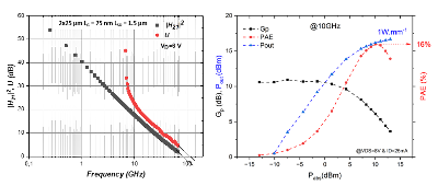 S’appuyant sur cette capacité de croissance, l’équipe de l’IEMN annonce la fabrication des premiers HEMT ScAlN/GaN haute fréquence produits par MBE à l’ammoniac. Les premiers dispositifs présentent des densités 2DEG de 3 à 4 × 10¹³ cm⁻² en utilisant des barrières ScAlN d’environ 10 nm, avec des mobilités électroniques comprises entre 500 et 1000 cm² V⁻¹ s⁻¹. L’introduction de couches de recouvrement ultrafines en AlN ou GaN représente une autre innovation significative, atténuant la susceptibilité inhérente à l’oxydation du ScAlN sans compromettre le transport des électrons. Ces hétérostructures recouvertes permettent un traitement stable, conduisant à des HEMT à grille courte (75 nm) sur silicium avec une fréquence d’oscillation maximale supérieure à 100 GHz, une densité de courant de drain de 1,35 A mm⁻¹ et une transconductance de 284 mS mm⁻¹ — des mesures de performance qui positionnent les HEMT ScAlN/GaN comme de solides candidats pour les applications en bande Ka. Les performances de puissance sont évaluées pour la première fois à 10 GHz sur ce système de matériaux : une puissance saturée de 1 W.mm⁻¹ est obtenue, et une amélioration supplémentaire est prévue puisque les verrous matériels/technologiques ont été identifiés.