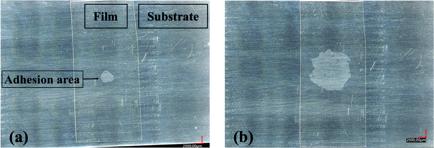 Figure 2 : Adhérence d’un film de PVC à un substrat d’aluminium pour deux champs électrostatiques d’intensité croissante. Tension appliquée 3,6 kV (a) et 3,8 kV (b)